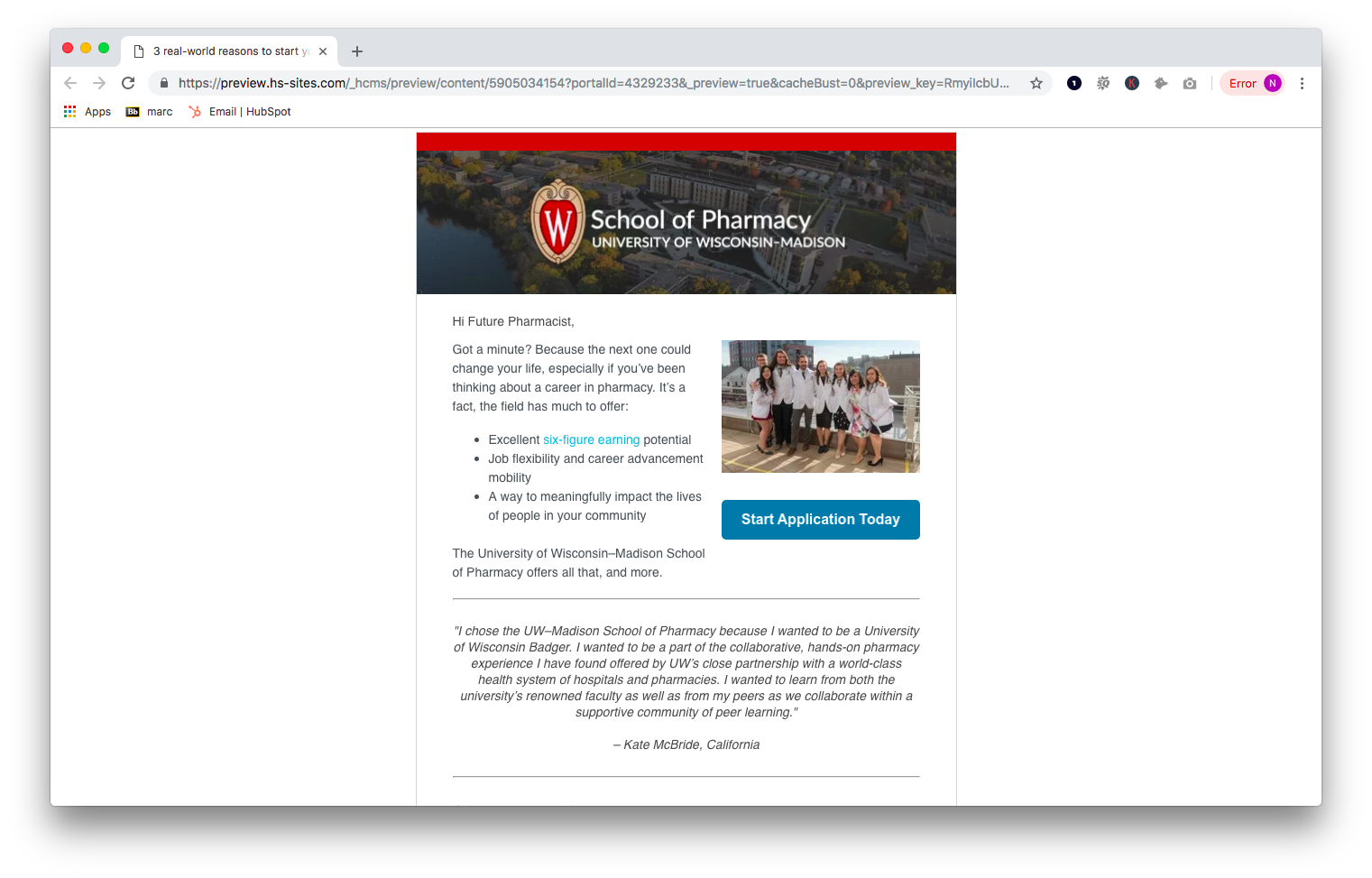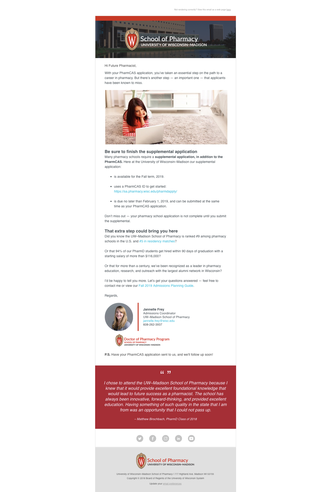 First, prospective applicants were encouraged to apply through a multi-email drip workflow that gave both early decision and non-early decision applicants crucial information about how to apply, why they should apply, and why they should choose the University of Wisconsin–Madison School of Pharmacy. The implementation of this campaign allowed the School of Pharmacy to start a conversation with a large number of prospective applicants, both increasing the quantity of applicants and the quality of applicants.
